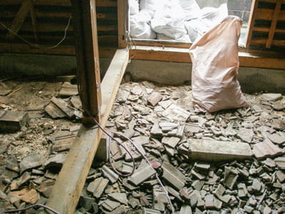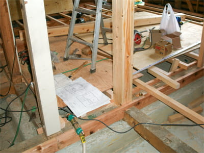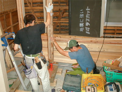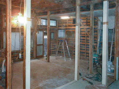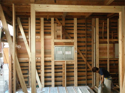 今回のリフォームの一番の目的が耐震補強です。 1階部分の床や壁はすべて解体して、スケルトン状態にした上で補強をかけ、建物の耐震性能を高めます。