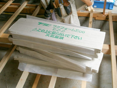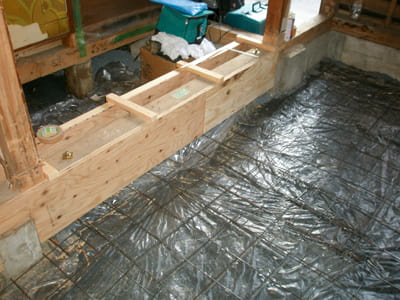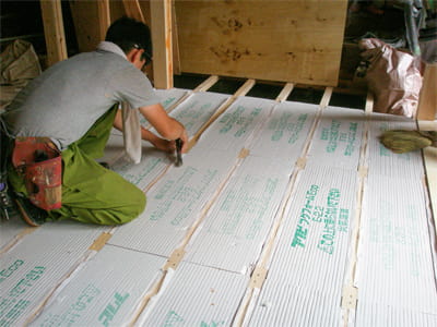 今回のリフォームで1階部分をスケルトン状態にするのに合わせ、床と壁、天井に断熱材を入れて、床下から上がってくる冷気もシャットアウトします。 室内全体を一定の温度に保つ、言わば、空気のバリアフリーです。