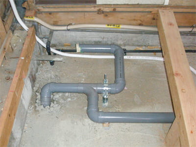 奥ではキッチンの設置中。手前はトイレの壁です。細かくサイズが書き込まれています。
