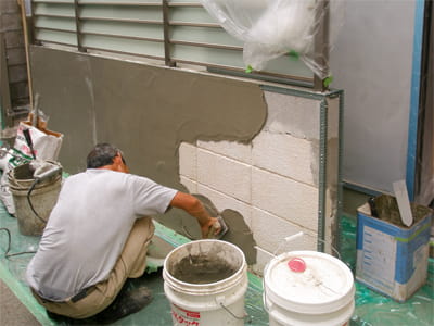ラスカットパネルの上から、下地のモルタルを二度塗りします。