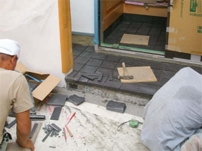 玄関ではタイルを施工中。職人さんの腕できれいに仕上がりました。