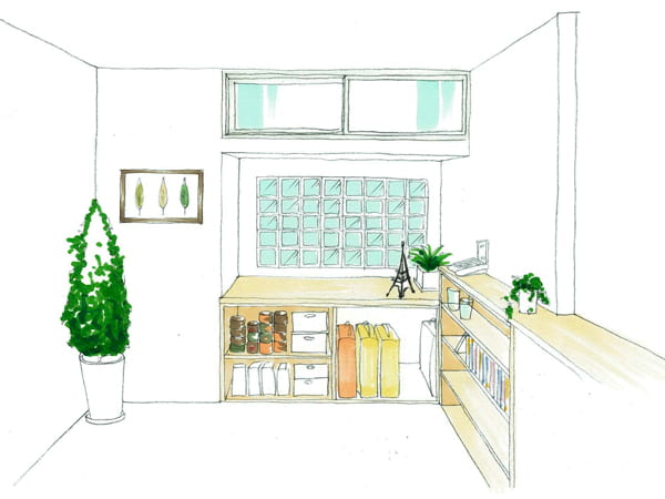 出窓の下に造作した収納には、猫ちゃんのおもちゃや日用品をしまう想定です。 事前に作成したイメージスケッチをS様にご覧いただき、実際の使用シーンを想定してもらいました。