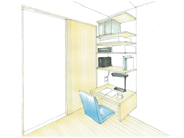 クローゼットの横には、お父様専用の収納棚を設けました。足元が掘りごたつ風になっていて、ミニデスクとして使えるユニークなものです。 足元は断熱されていて暖かく、スタンド照明用のコンセントも完備。