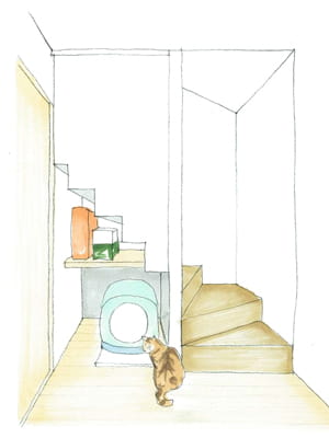 階段下を猫ちゃんのトイレスペースにして、ドアにはキャットドアを設置。 リビングの壁にはキャットウォークになる飾り棚を取り付けます。