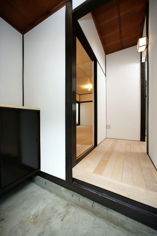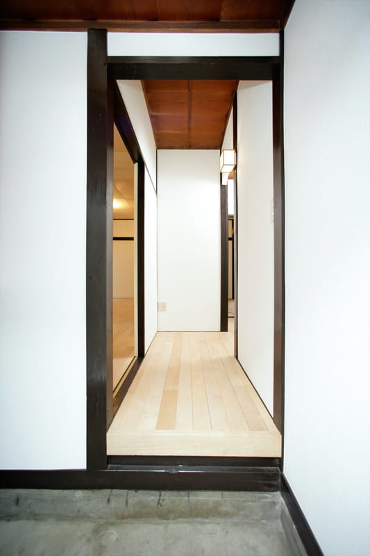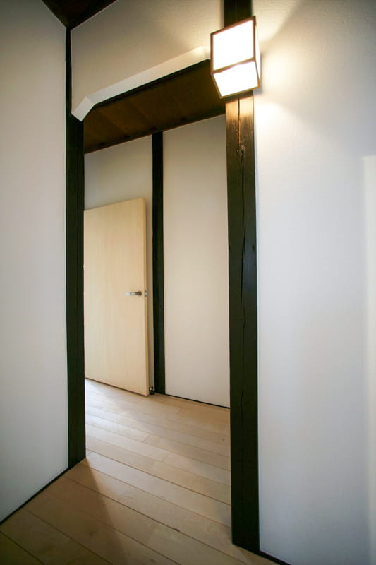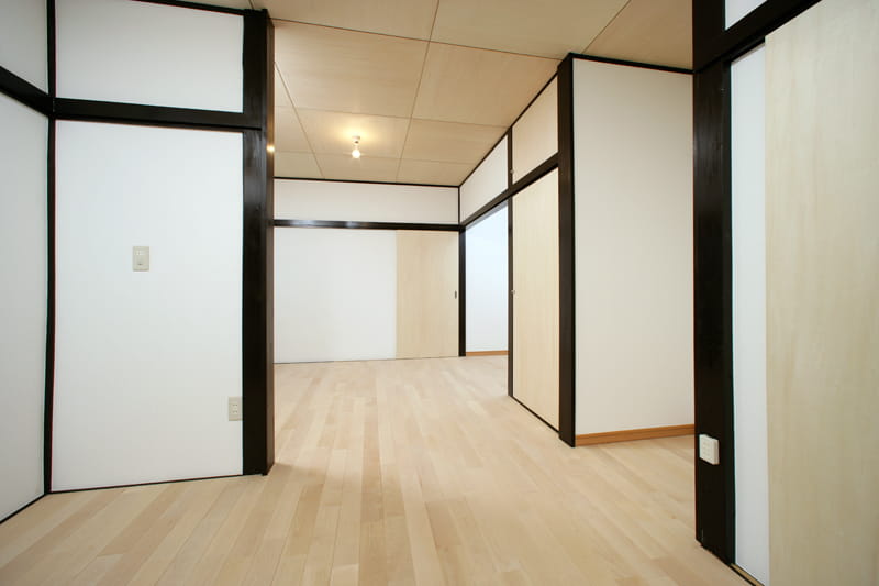 床と天井、建具が美しく調和した空間となりました。 仕上げには蜜蝋ワックスや自然素材のオイルを使用しています。