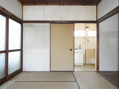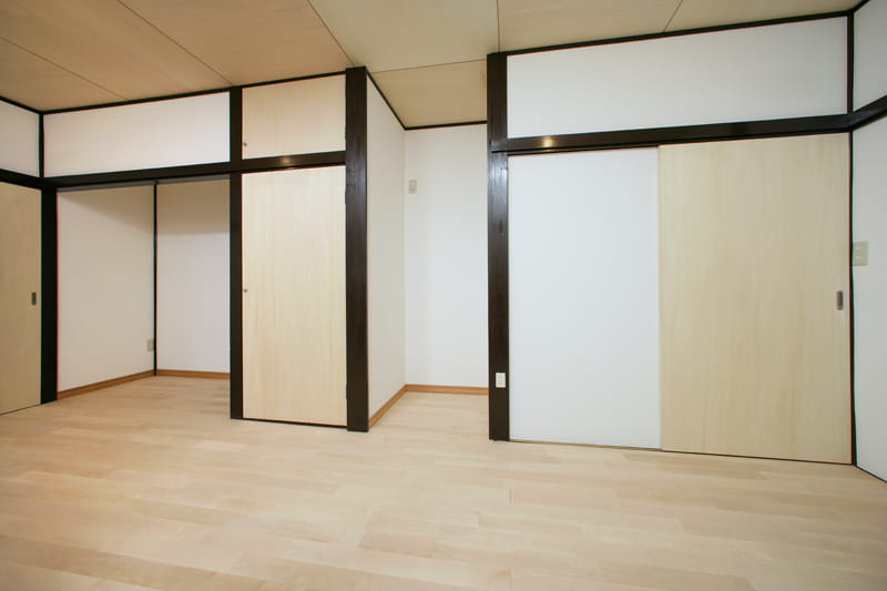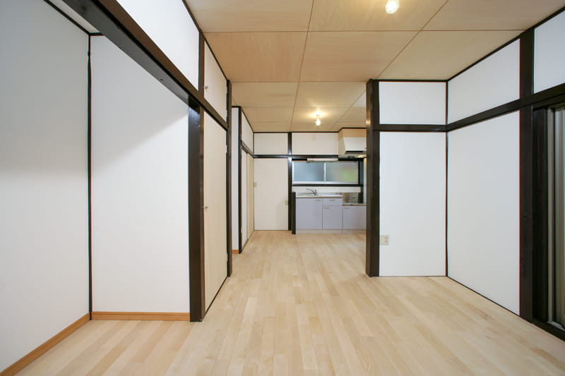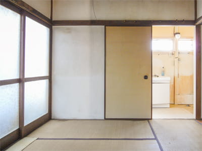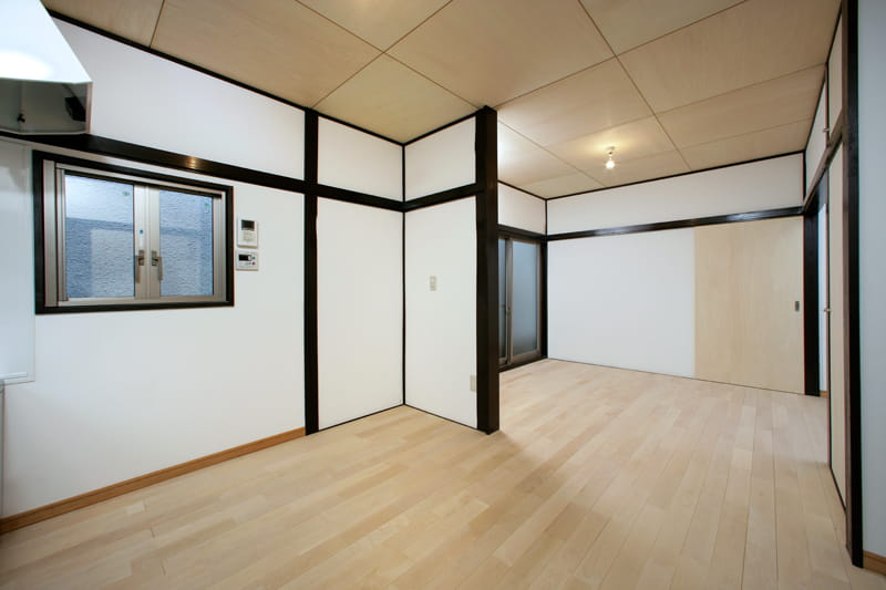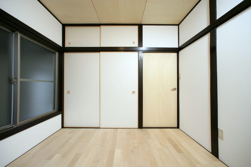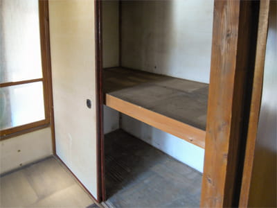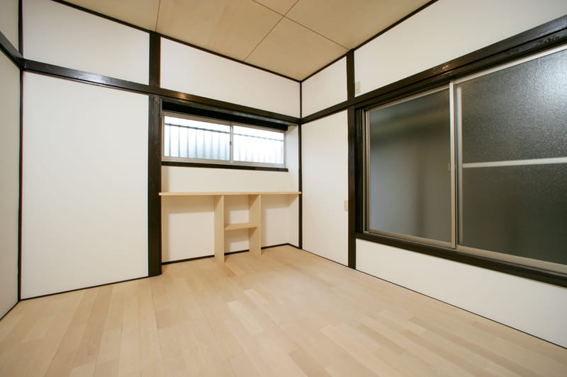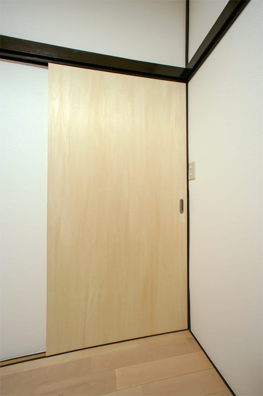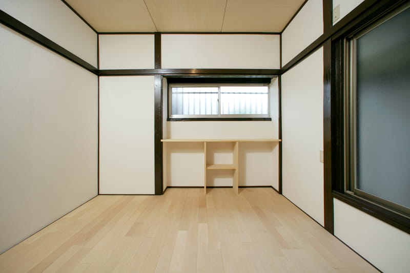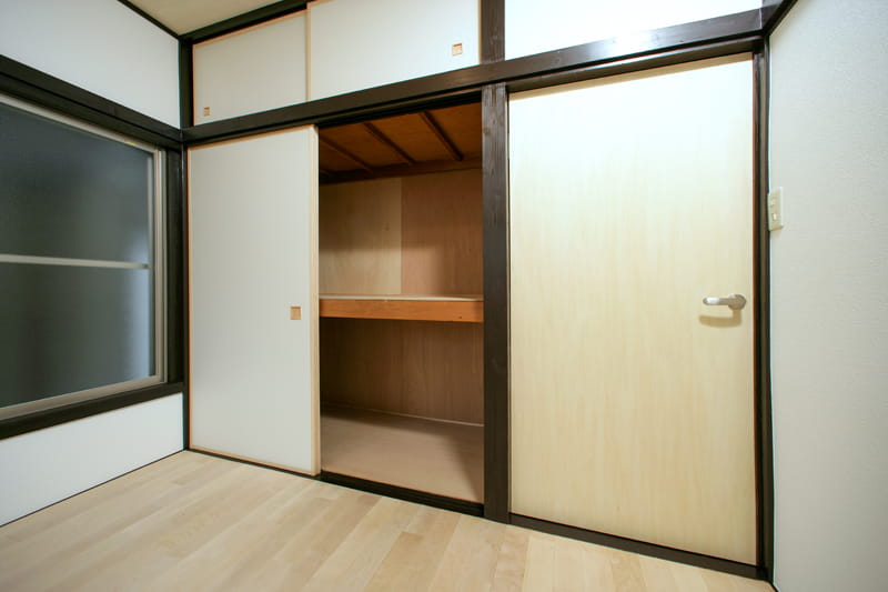 木枠の窓はアルミサッシに替え、襖はシナの板で造作しました。 押入れの中もきれいにクリーニングして、気持ちよくお使いいただけます。