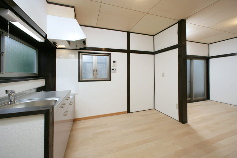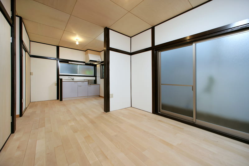 和室2部屋の間の障子を撤去して、リビングとダイニングをひとつながりの空間に。 耐震性を考慮して一部の壁を残しましたが、無垢フローリングがフラットに張られているため、違和感のない仕上がりになっています。