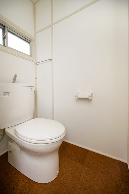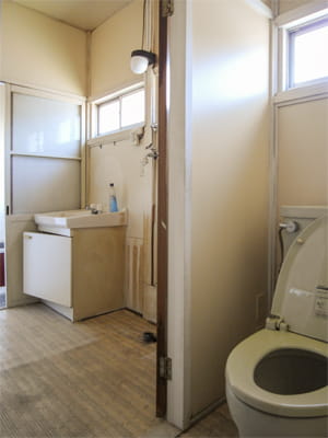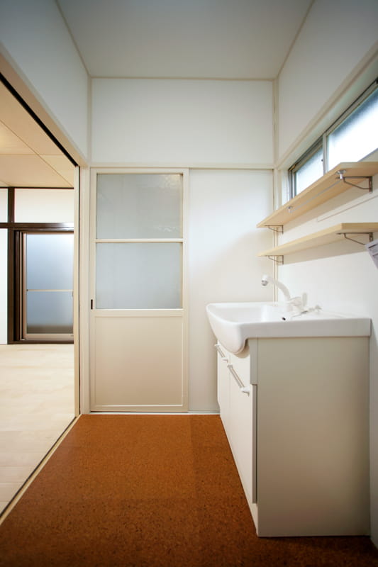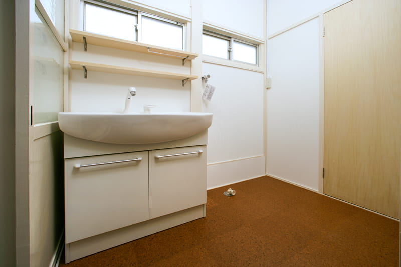 洗面化粧台とトイレは、設備を新しいものに取り替えて、使い勝手が良くなりました。 床は、水に強く足ざわりがいいコルクタイルを採用。 壁も塗り直して、明るい雰囲気になりました。