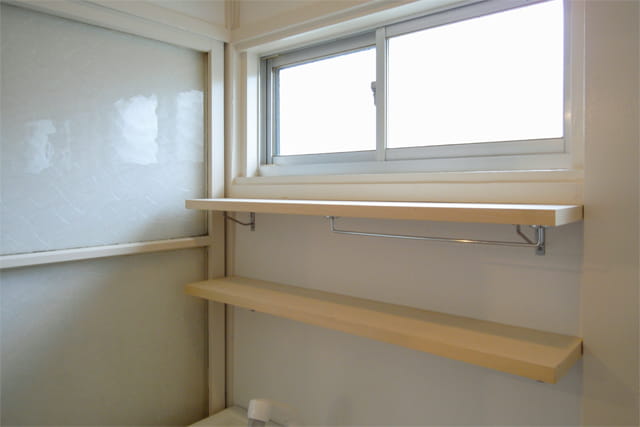 洗面台の上には窓があるため、明るさを保つために鏡は取り付けず、棚を造り付けました。 小さな鏡を置けて、歯ブラシなどの小物を置いておくのにも便利です。 タオルをかけられるよう、ハンガーパイプも設置しました。