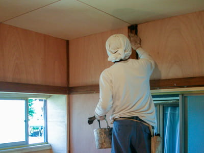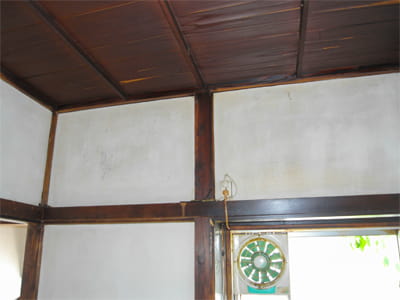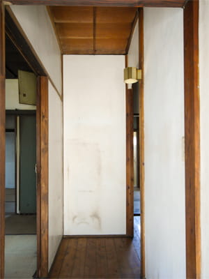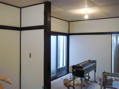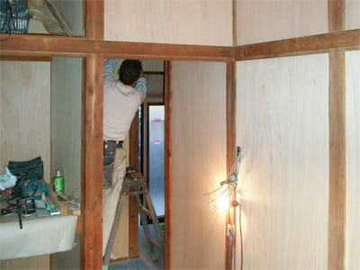 元の土壁を下地として利用し、上から合板を張ります。柱が見えている真壁工法です。