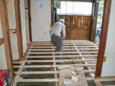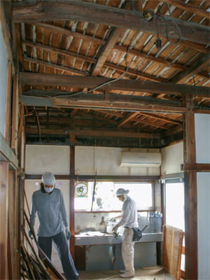 床と天井は全面的に解体して、内部の構造体に傷みがないか、入念にチェック。 もともと平屋で丈夫な建物ですが、床と天井を下地から造り直して、より頑丈で安全な建物にします。