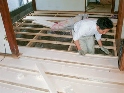 床下から上がってくる冷気を防ぐため、床に断熱材を施工しました。