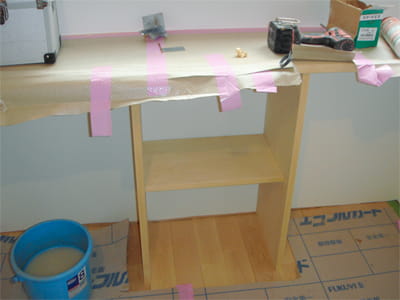 クロスに塗料が付かないように、ビニールで覆って養生します。