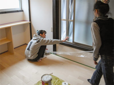 無垢フローリングは最後に塗装して仕上げないと、木が反ってしまうことがあります。 T様邸では、リボス社のオイルを使った自然塗装仕上げを選ばれました。