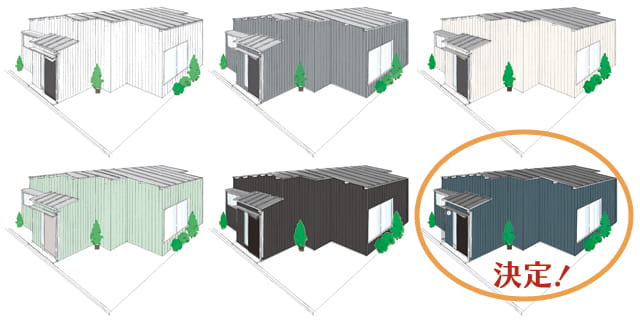 T様邸はコンパクトな建物なので、外観の色によってお住まいの印象が大きく変わります。 外観のカラーイメージをいくつか作成したところ、T様は私たち一押しのネイビーのパターンを選ばれました。