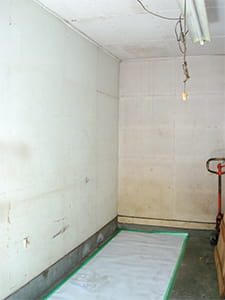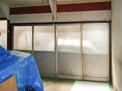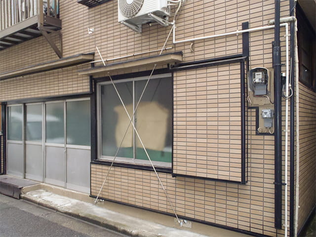倉庫の入口がある一面は、すべてが窓と引き戸サッシの開口部になっていて、耐震面での不安がありました。 当初は一部の窓をふさいで耐力壁にする予定でしたが、重量の大きな機械があって動かせず、工事ができません。 そこで、外壁側から耐震補強を行うことになりました。