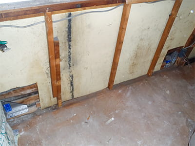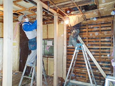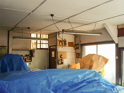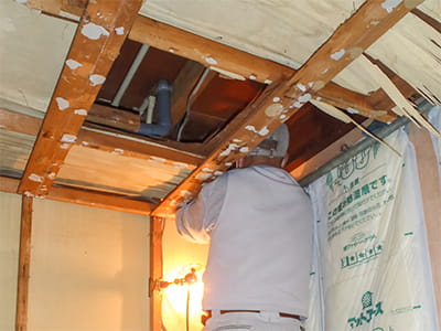 倉庫と居住部分を隔てる壁には、柱が入っているだろうと予測していましたが、実際に解体してみると柱はありませんでした。 この部分の天井には鉄骨の梁が入っているため、重い梁を支えられる構造に補強します。