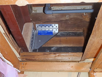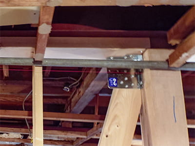 そこで開口部には、制震効果がある金物、仕口ダンパーを設置することにしました。 仕口ダンパーは柱と梁などの接合部に設置するため、壁や天井を一部壊してから取り付けることになります。
