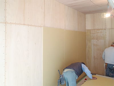 地震に耐える力を持つ構造用合板で壁をふさぎ、ボードを張ります。
