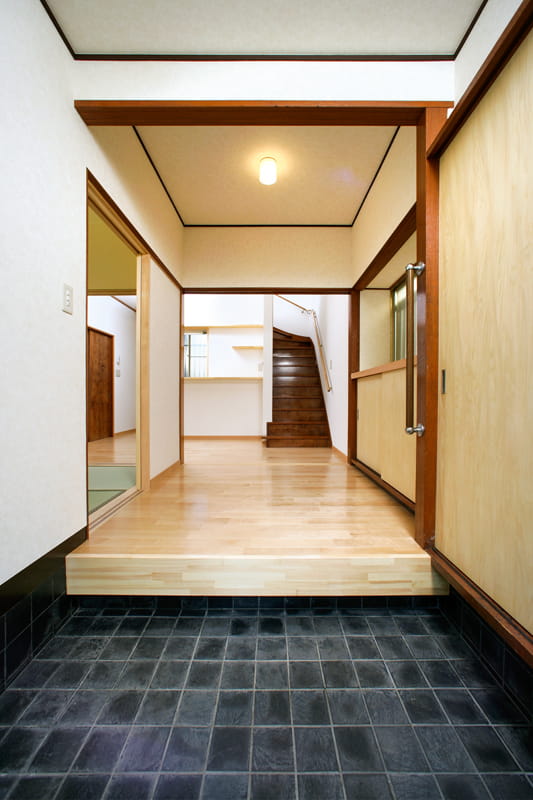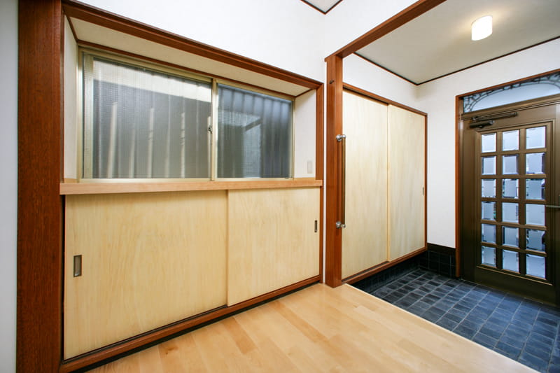 木目のやさしいカバザクラは明るい印象で、グレーの玄関タイルや濃いブラウンの木枠にもうまく馴染んでいます。 明るくなりつつも昭和の家の味わいを残して、全体が調和している空間に仕上がりました。