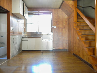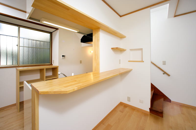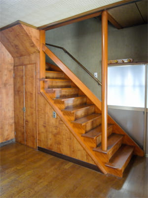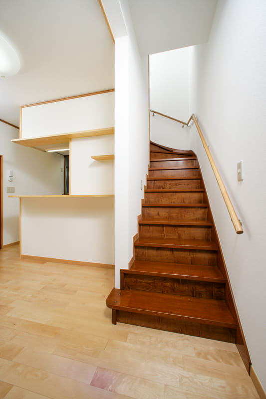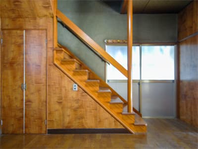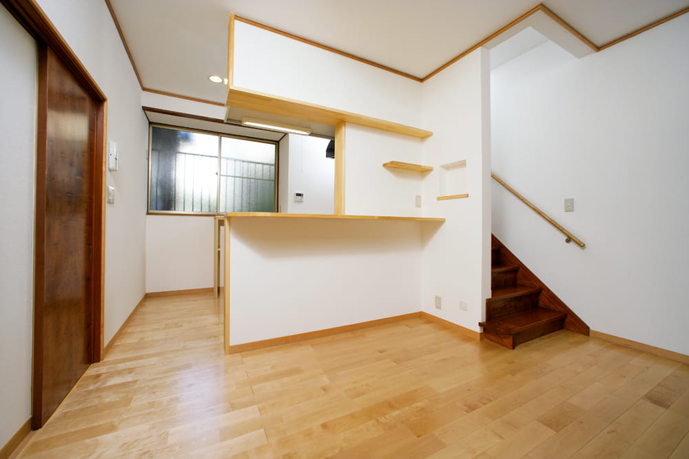 階段はリフォーム後もそのままお使いになりますが、横に壁がないオープンスタイルの階段なので、お子様が上り下りすることを考えると不安があります。 そこで、ダイニングキッチンとの境に壁を造り、落下する危険のない階段にリフォームしました。 これなら安心ですね。