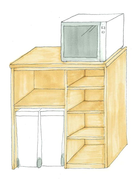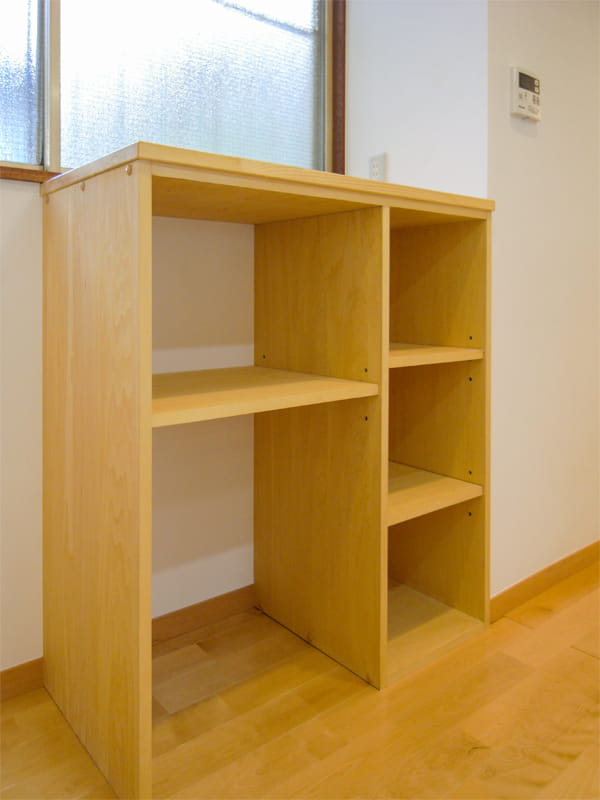 対面キッチンになったので、背面にはオリジナルのキッチン収納を設置しました。 ゴミ箱やキッチン家電などをまとめてしまえるように計画しています。