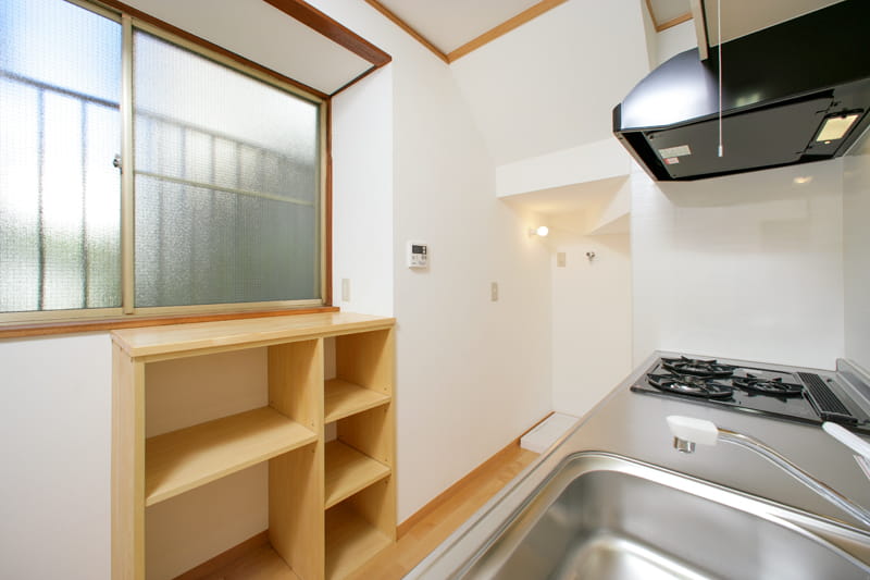 キッチンは家の北側にあたるため、壁には断熱材をしっかり入れ、オフホワイトの光触媒コーティングクロスを張りました。 このクロスは空気中のカビや雑菌、タバコやペットの臭いを分解し、空気をきれいにする効果があります。