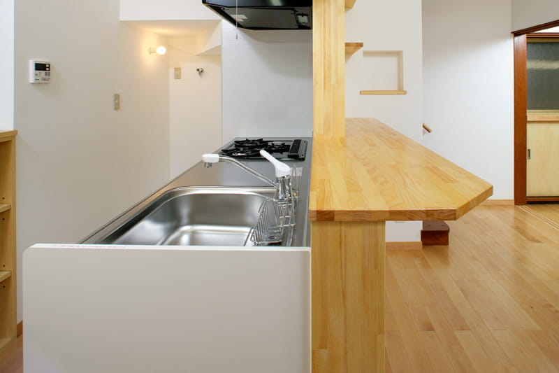 キッチンカウンターをよく見ると…、角のところがカットされています。 カウンターの脇を通ってお風呂やトイレに行く間取りになっているので、通る時に邪魔にならないように工夫しました。 この小さな工夫で、使い勝手が大きく変わってきます。