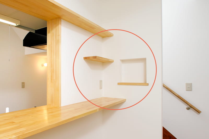 また、キッチン前面の壁と、ダイニング横の壁に、便利に使える小さなニッチ(飾り棚)を取り付けました。 季節の小物やグリーンなど、お好みで楽しく飾って楽しめます。 鍵などを置く定位置として使うのもおすすめですよ。