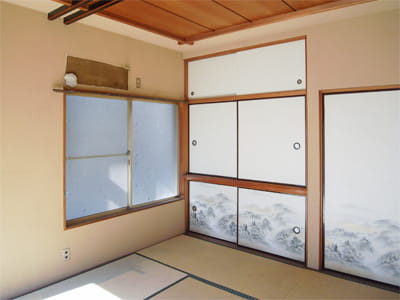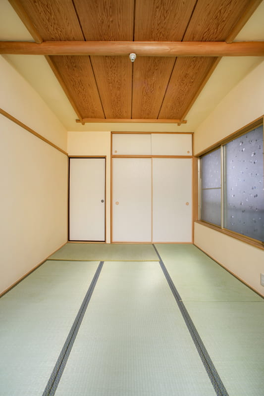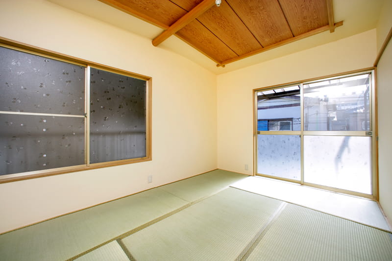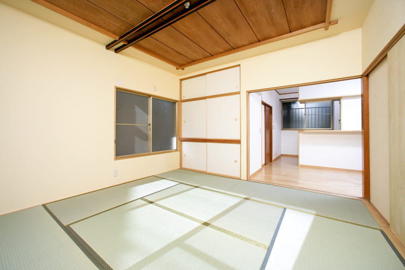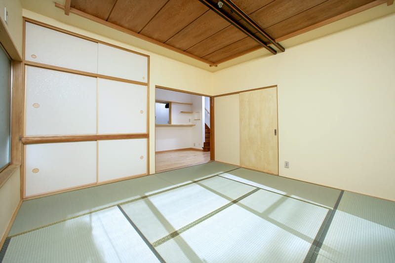 リビング横のお部屋は和室です。 内装をリフォームして、きれいにクリーニングを行い、元の雰囲気を活かした明るい和室に生まれ変わりました。