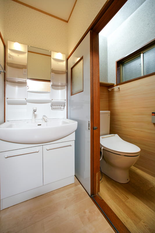 お風呂は広さを活かして在来工法でリフォーム。暗さが気になっていた洗面室も明るくします。