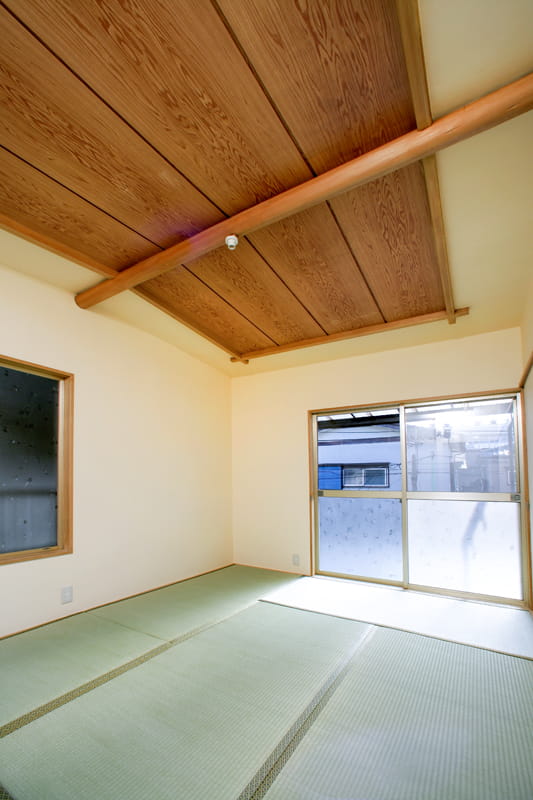 このお部屋のように、傾斜がついて真ん中が高くなっている天井を「船底天井」と言います。 数寄屋建築や茶室などでよく使われている伝統的な意匠です。 日本の家らしい味わいの素敵な船底天井は、リフォーム後もそのまま活かすことにしました。