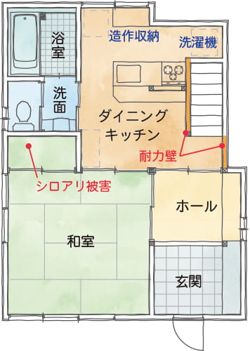 水まわりはシロアリ被害の起こりやすい箇所です。 雨漏りや水漏れなどで木材が濡れ、気づかないまま腐ってしまうと、シロアリがやってきます。 シロアリは家の構造部分を侵食して、木材がスカスカになるほどの食害を起こします。