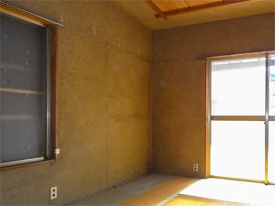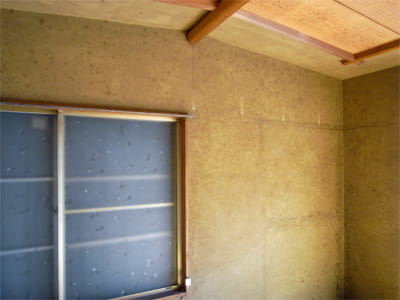 2階の和室は物置として使われていたようで、ホコリとカビが目立ちました。 壁はザラザラとした「じゅらく壁」ですが、かなり傷んでいたため撤去することに。 左官職人さんが専用の薬剤を使って、下地まで丁寧に剥がしてくれました。