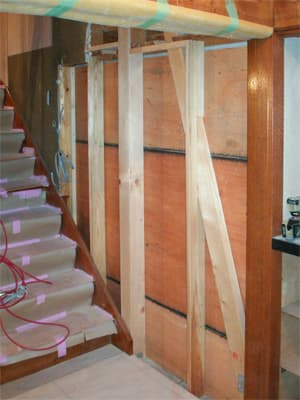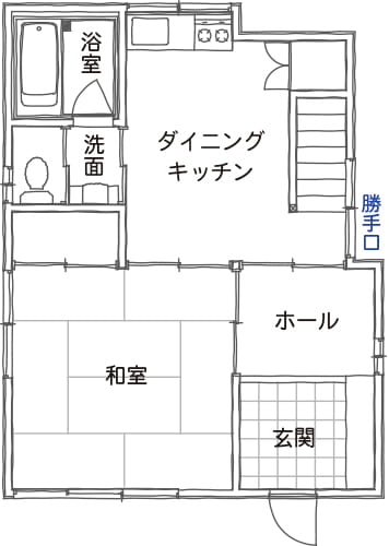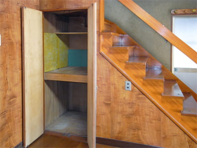 階段の横には勝手口がありました。大工さんの家なので、工具の出し入れなどに使われていたのかもしれません。 しかし今回のリフォームで耐震性を考慮し、勝手口をなくして耐力壁にすることとなりました。