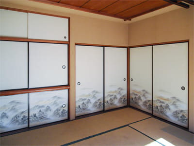 リフォーム前は和風の柄入りの襖が並んでいましたが、シンプルな無地の襖と無垢材の建具にリフォーム。 壁も和風のじゅらく壁からクロスに変わり、一気に明るい印象になりました。