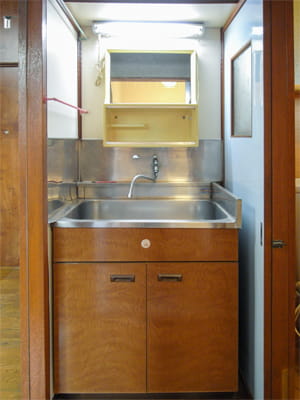 白い洗面台に交換し、クロスを張り替えて、ぱっと明るい雰囲気に。 床は無垢フローリングを張り、水に強いウレタンコーティングで仕上げました。