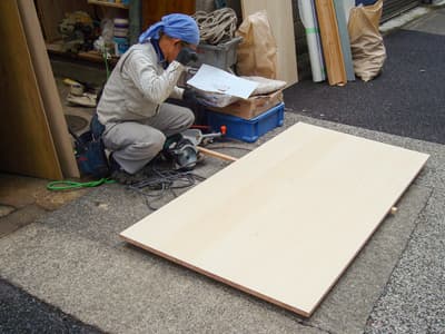 建具の製作は、現場では場所を取りすぎるため、作業場で行いました。 丁寧な仕事で、ぴったりサイズに仕上がりました。