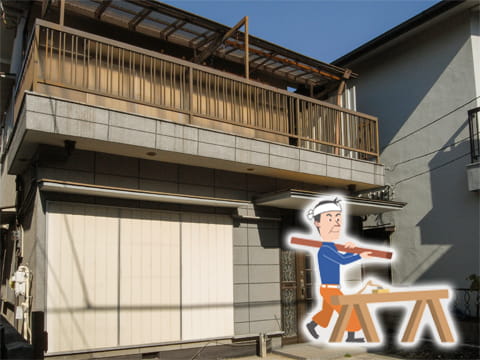 2階の広いベランダは、経年で防水部分の劣化が目立ちました。 このまま放置すると雨漏りの原因になり、雨漏りによってシロアリ被害を受けやすくなってしまいます。