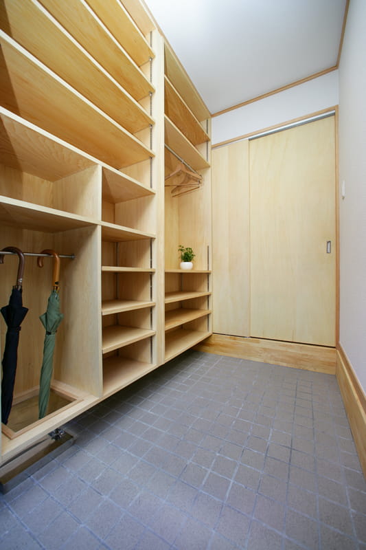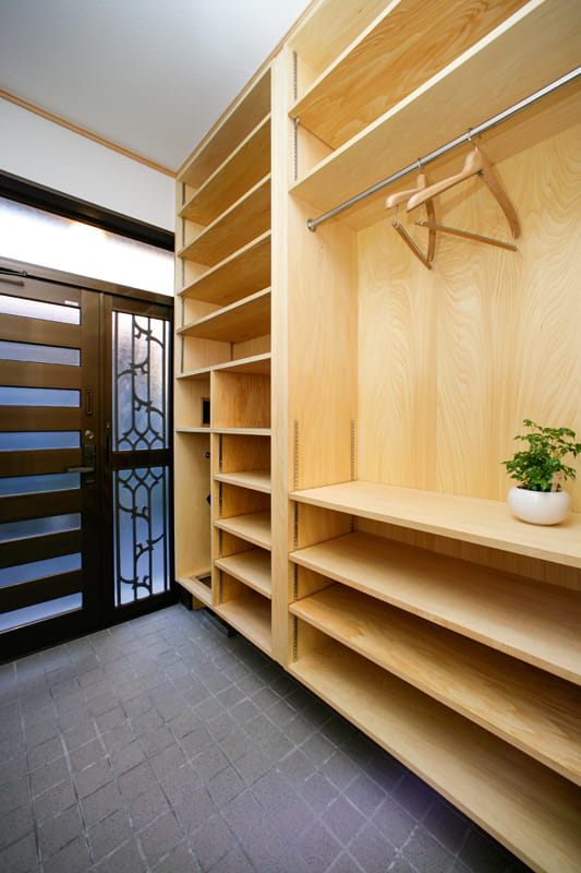 やさしい木目が印象的な天然木のシナ合板で造作した、オリジナルの玄関収納です。 玄関収納は扉付きのものが多いですが、F様邸の玄関収納は扉のないオープンなタイプ。 扉が自転車の邪魔にならないように配慮しました。
