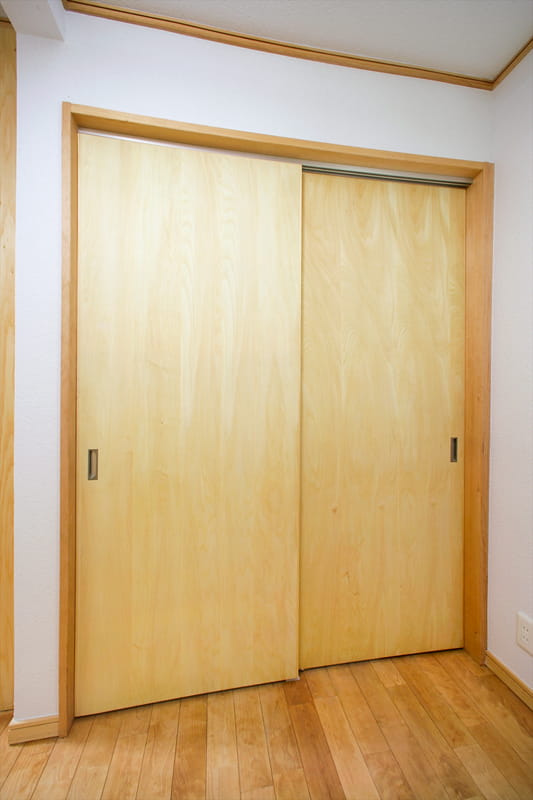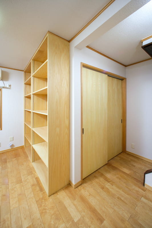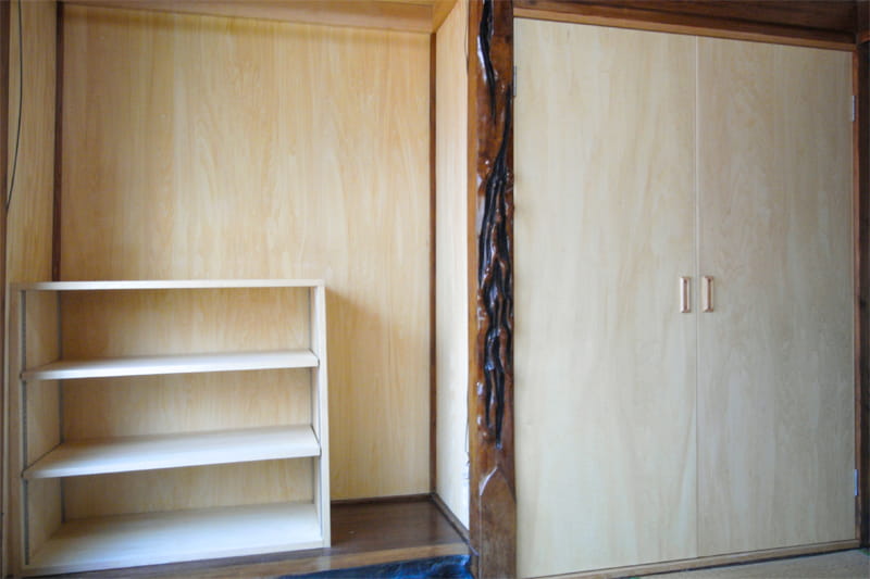 隣は押入れですが、襖が傷んでいたため、シナの建具に交換しました。 天然木のシナは洋室だけでなく、和室にもぴったりです。