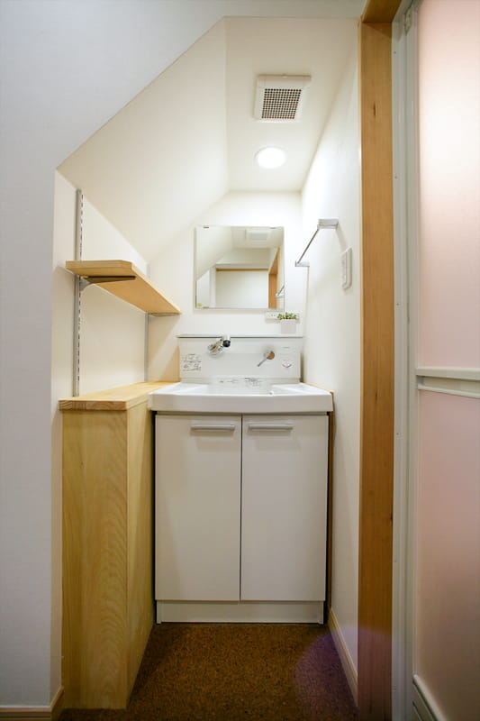 トイレの移動にあわせて、洗面台を階段下に新設しました。可動棚も設置して、コンパクトながら便利にお使いいただけます。