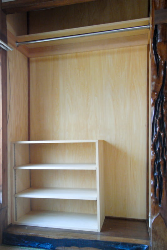 床の間を収納としてリニューアルしました。 コートなどをかけられるよう、上部にハンガーパイプを設置。 オープンな収納棚にもお洋服をしまわれる予定です。