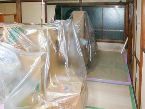 まずは2階に上げた荷物に汚れやキズがつかないよう、シートで覆って養生してから、解体工事を始めます。