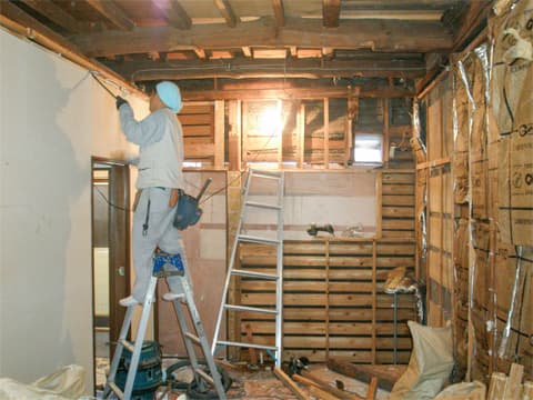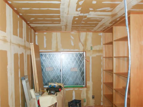壁と天井に石膏ボードを張りました。この上にクロスを施工します。