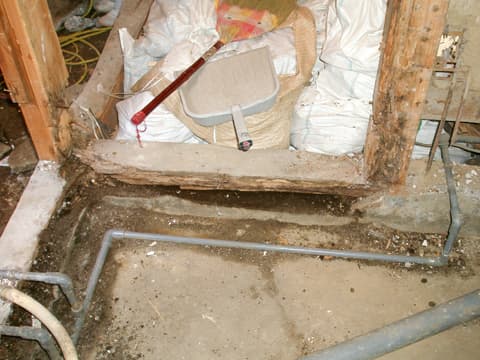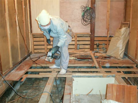 お風呂やトイレなどの水まわりで、シロアリの被害が見られました。 特にお風呂の土台は被害が大きく、グズグズの状態です。 後から増築されたお風呂の接合部分から雨漏りが発生していたようです。