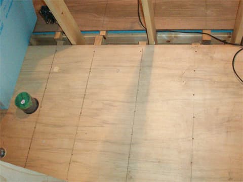床の無垢フローリング張り。無垢材は収縮するため、少し隙間を開けて施工します。