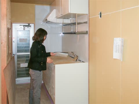 キッチンが取り付けられました。コーディネーターの千葉が細かくチェックします。