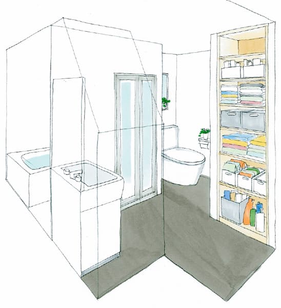 今回の計画で、お風呂と洗面脱衣室、トイレを1つの空間にコンパクトにまとめ、窓の位置も変えて風通しも良くします。