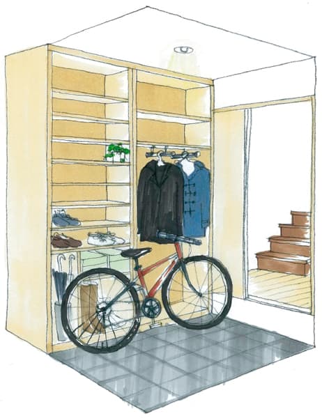 そこで、玄関の土間を広げて、自転車を置く場所を確保することに。 あわせて大容量の玄関収納を造作し、コートや傘もしまえるようにします。